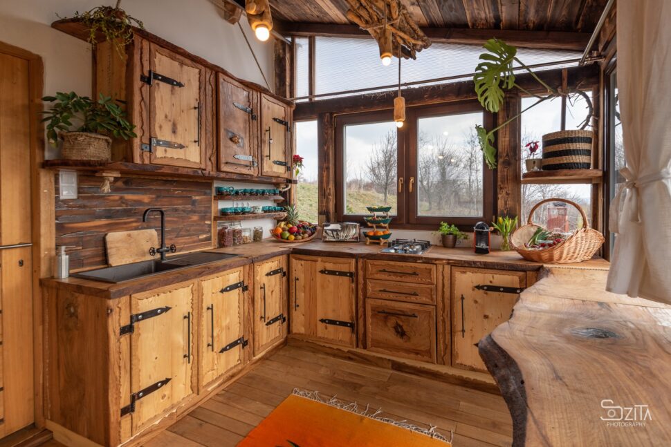 A Főépületünk egy valódi történetekkel teli hely, mert minden egyes anyag, amit felhasználtunk, jött valahonnan – de nem a fatelepről. Voltaképpen minden újrahasznosított anyag, a bútorok, díszek, a padló deszkái lábon száradt fából készültek, ugyanis nem akartunk élő fákat kivágni csak azért, hogy az általunk elképzelt tárgyak megszülethessenek.